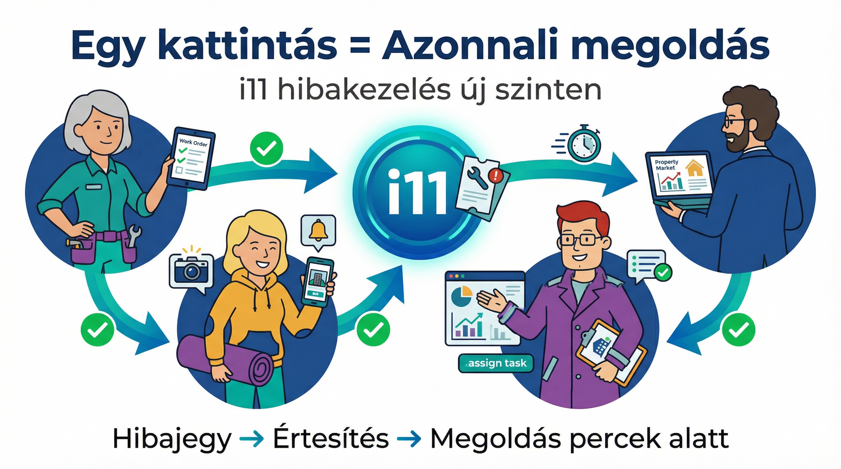 Az I11-ben a hibajegy életútja pontosan követhető, minden szereplő számára. A bérlő látja a státuszt, a manager látja a feladatokat, a szerelő pedig tudja, hova kell mennie, mit csinálnia, és mit kell dokumentálnia. A folyamat nem szakad meg, nem veszik el, nem marad félbe.